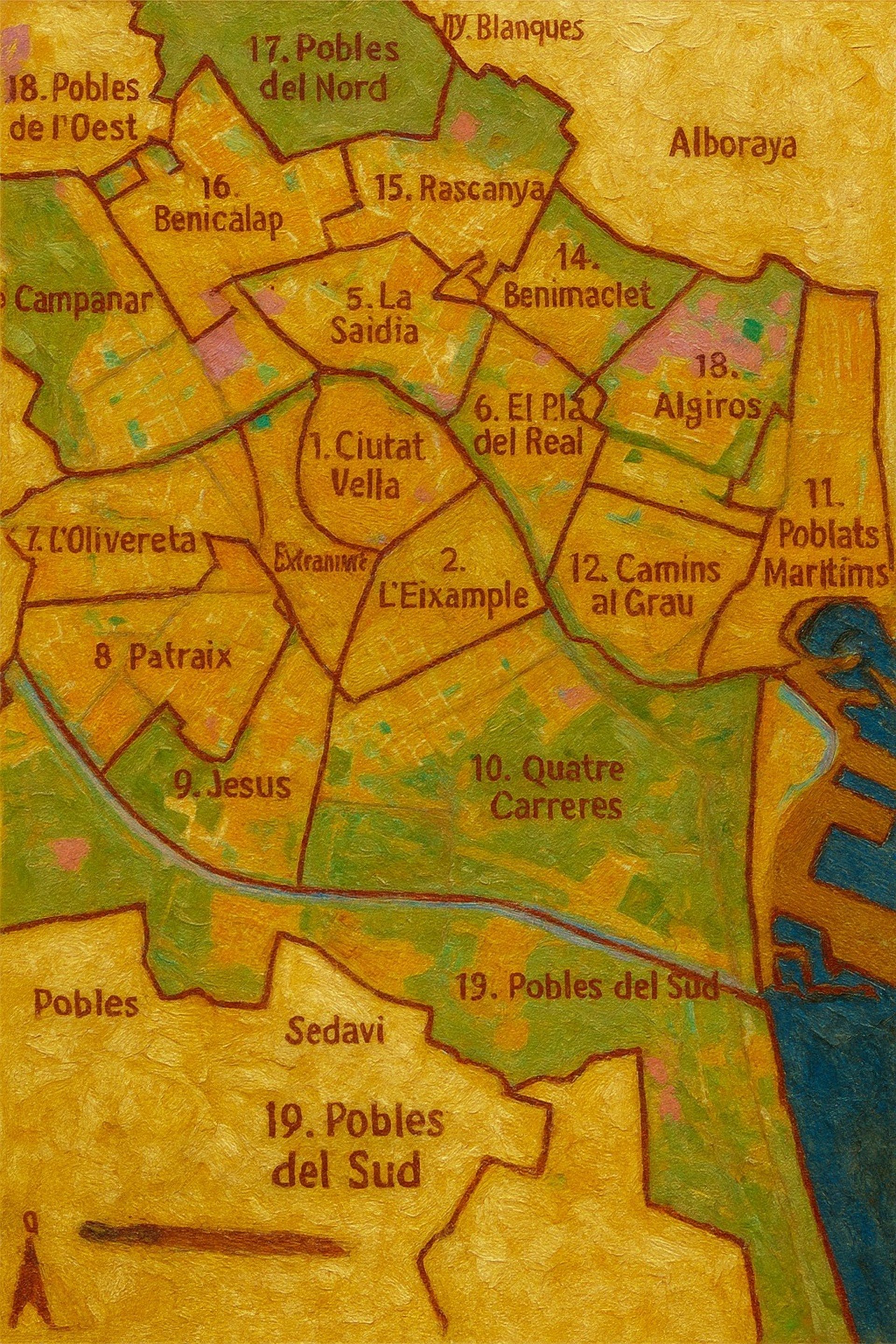 Esta división refleja la expansión de Valencia más allá de su núcleo histórico: incluye desde el casco antiguo medieval hasta antiguos pueblos independientes que fueron incorporados al municipio en los siglos XIX y XX.